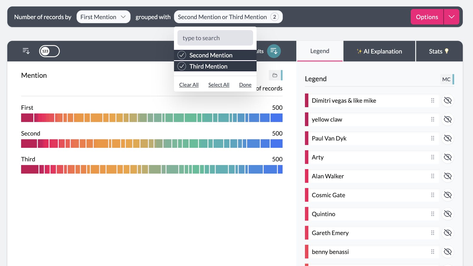 This example demonstrates grouping three different “mention” columns. After cleaning the data in AddMaple by merging similar mentions, we’ll now show you how to group these columns together so you can explore the grouped totals.