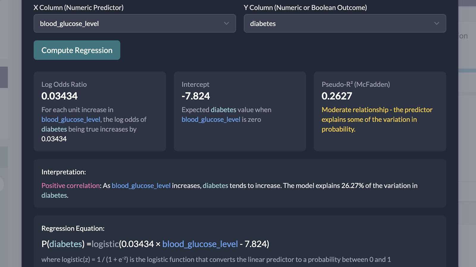 A pop up box will appear where you can choose the columns to perform the regression on. Currently we support linear and logistic regression between numeric columns and binary columns (either a boolean column or a multiple choice column with 2 categories).